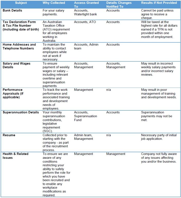 As part of the ongoing employment relationship that exists between you and the company, Watertight needs to collect and store a variety of personal information about you. The following is a list of this information along with a description as to why it is collected, who has access to the information, who you should notify if the details change and the ramifications to you if the information is not provided.